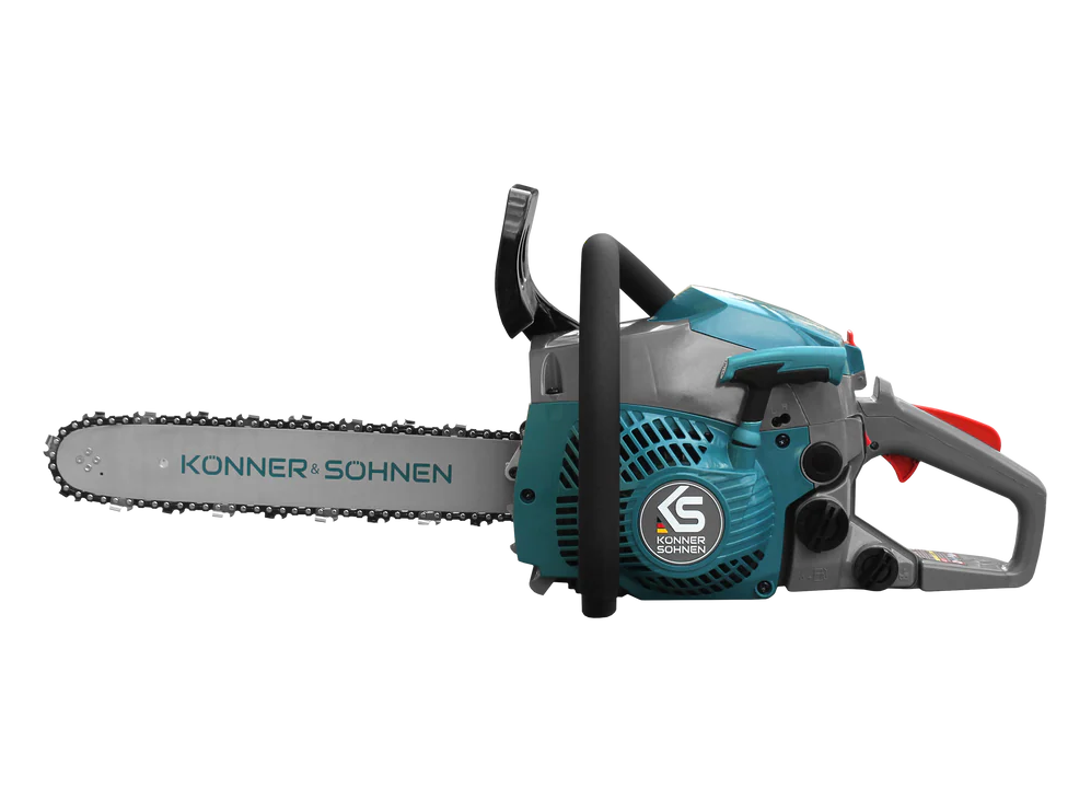 KS CS18G-14C gasoline chainsaw by German brand Könner & Söhnen® (35 cm bar, 1.35 kW, 13000 rpm) — a reliable tool for household work. Reliable engine ensures efficient fuel combustion. Quick-access filter clip simplifies maintenance. “Summer/Winter” modes protect carburetor from icing, while inertia brake instantly stops the chain. Convenience features are enhanced by auto STOP/START button, tool-free chain tensioning, “Easy Start” system, ergonomic handle for a firm grip in any position.
