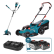 • Maximum benefit from purchasing the set — by buying the full cordless lawn care kit: lawn mower, garden trimmer, and dual charger, you get 2 x 4Ah batteries as a gift.