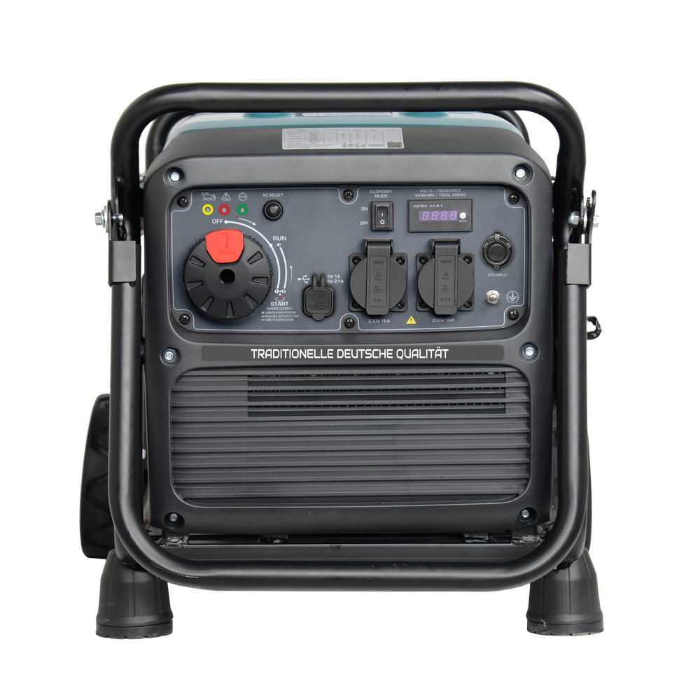 Kõigi funktsioonide mugav asukoht: multifunktsionaalne LED-ekraan (tundide loendur, sagedus, pinge), töörežiimi indikaator, ülekoormuse ja lühise kaitse, madala õlitaseme andur, lähtestusnupp juhtsüsteemi lähtestamiseks ja pingetoe taastamiseks, kaks USB-porti 5 V/1 A, 5 V/2.1 A, 230 V pistikupesad ja maandusterminal.